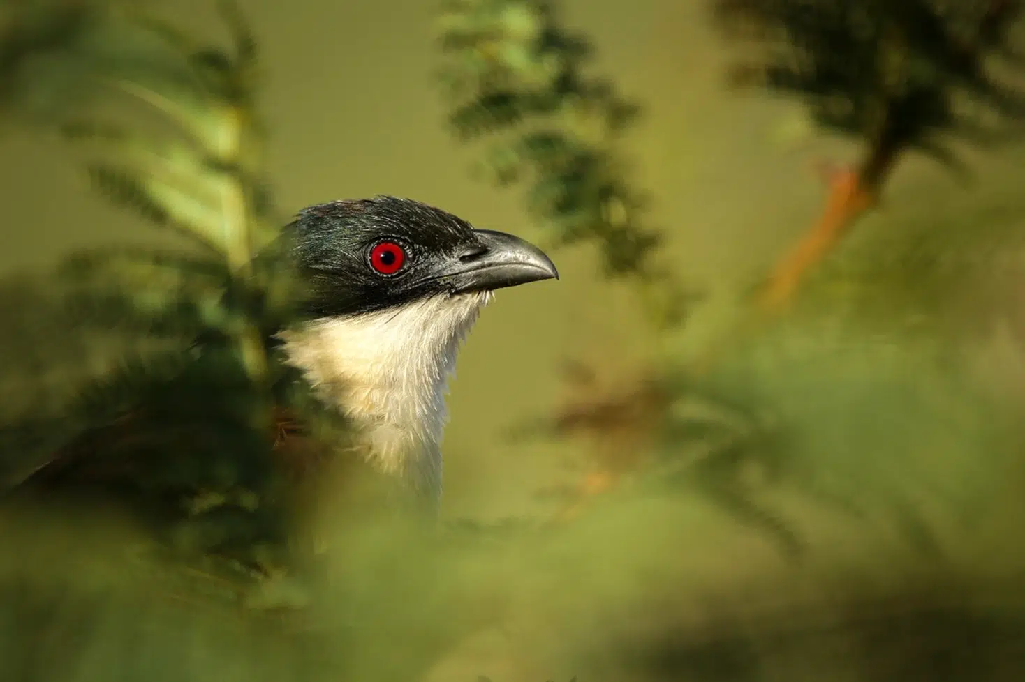 Being summer in the Southern Hemisphere, the sun rises just after 5 am. Departing on our morning safari at 5:15, it is already light outside, and field guide Gill is heading in a westerly direction through Pilanesberg National Park. First up, we spot a tower of giraffes in the distance with a young foal getting separated from its mother. The other giraffes are moving closer to ‘inspect’ this youngster with lots of curious sniffs and long necks leaning in. Two black- backed jackals are hidden in the camouflaging grass. A Burchell’s coucal with its red eyes is perched at the top of a tree.