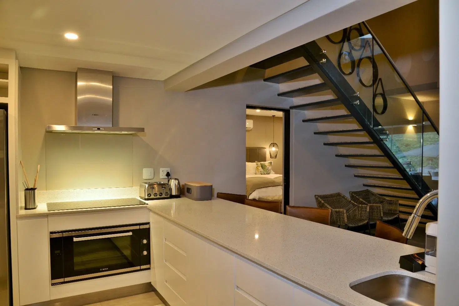 Spectacular black and white photographs by Graham Springer are framed and take pride of place on the bedroom walls. The bedroom to the right has elephant photos, while the left-hand side room features a majestic leopard. In the upstairs master suite, lions are the focus, with a gorgeous depiction of a lone lion with an impressive mane, a male with members of the pride to his right, and a lioness with a cub in a pensive mood. Striking photography by David Ballam adorns the walls in the lounge, dining room, and kitchen. David’s large black and white prints are inspired by the people, places, and cultures of Africa.