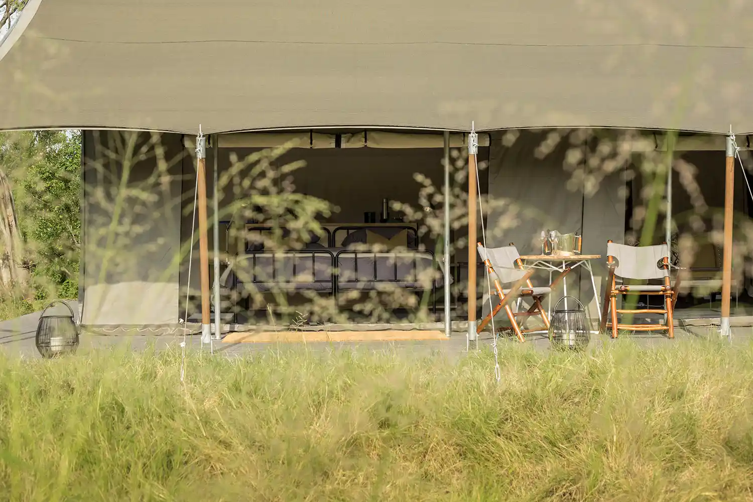 My tent with its cream-colored canvas walls is airy and spacious, with two three-quarter beds, a couch for seating, an indoor and outdoor shower, double vanities, an outside area for viewing the passing wildlife, and the only difference to the other rooms – a beautiful freestanding outside bath. It is amazing what a difference the light color of the tented ‘walls’ makes, giving such a roomy feel whilst blending in with the surroundings of the grasslands.