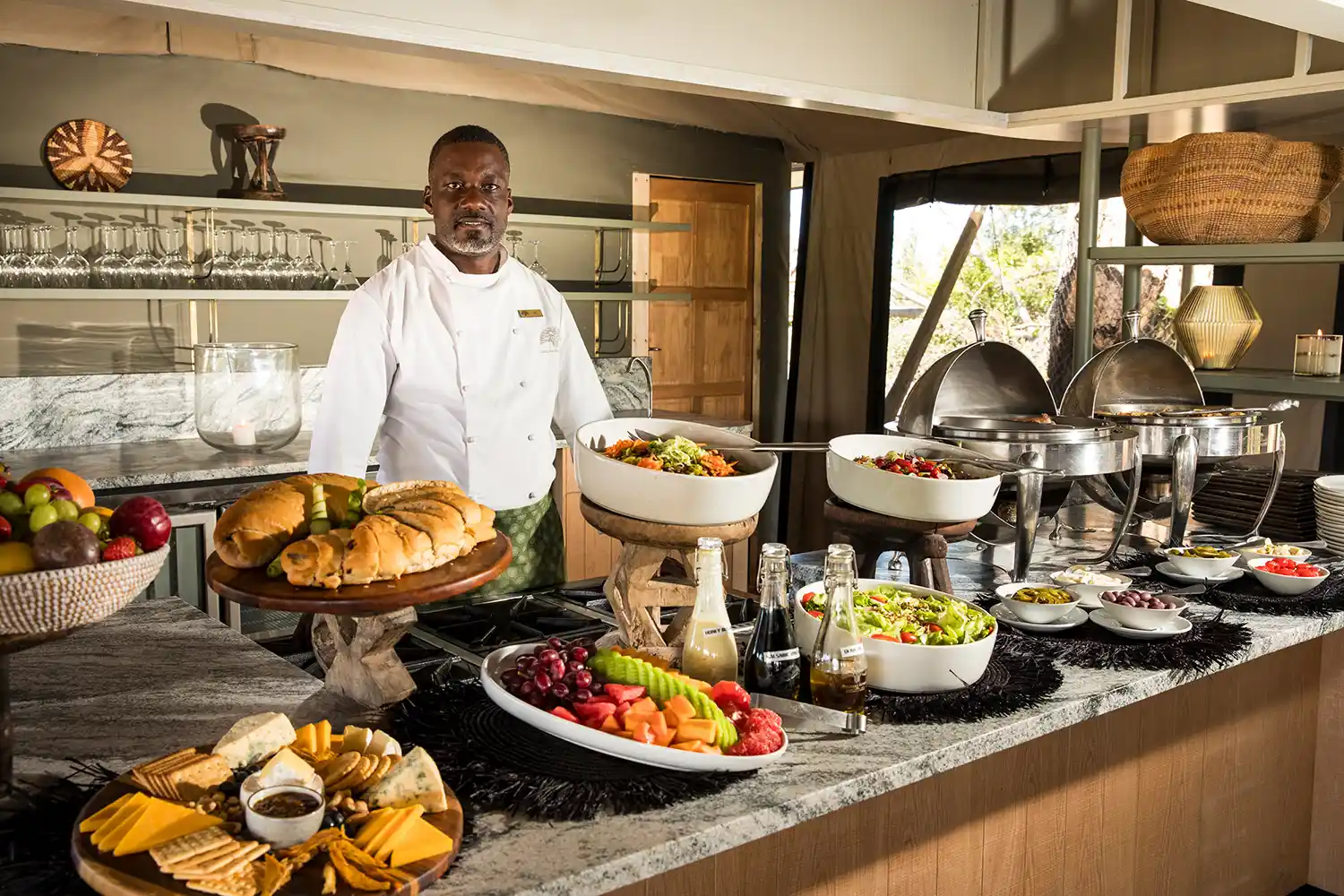 Back at the main area, I meet Andrew and Rhona Currell, management couple extraordinaire, and their delightful daughter, Amy. With their background in lodge management and Rhona’s expertise in cuisine, they are the perfect fit for Gomoti Plains Camp. It is time for high tea before departing on my first game drive. Today’s spread consists of banana bread, cranberry slices, vegetable wraps, iced tea, iced coffee, and ginger lemonade.