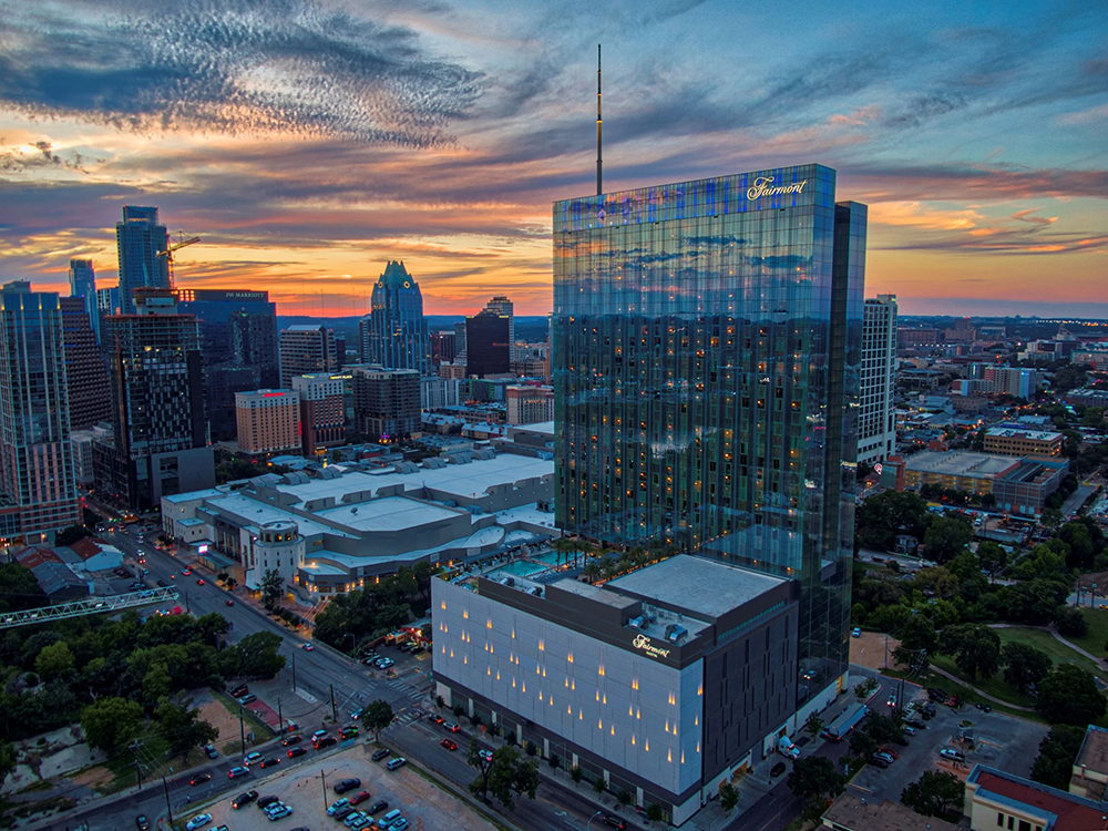 This Fairmont Austin can’t be missed – not only because of its towering size (there are 1,400 rooms, making it the largest hotel in Austin) and suites with dramatic floor-to-ceiling windows, but also its superb social spaces. There’s Grill House, Garrison, which won the AAA Four Diamond award and cooks up unbeatable ribs. Next to it, you’ll find Fulton, a date-worthy spot under the big oak tree at lobby level. And the pool, our highlight, is summer’s most happening party. Up on the seventh floor, it’s the post-pandemic celebration everyone’s been longing for, with food, cocktails, music, palm trees, and Austin sunshine.