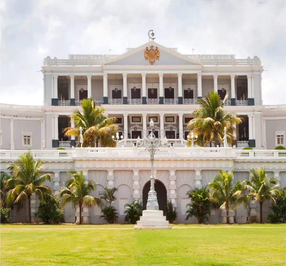 - Former palace offering royal luxury and grandeur. Once the hilltop residence of the Nizam of Hyderabad, Taj Falaknuma Palace delivers royal splendor. Perched nearly 2,000 feet above the city, it overlooks marble courtyards and gardens. Details matter: a 101-seat dining hall, Venetian chandeliers, and horse-drawn carriage arrivals. Book the evening heritage walk for golden-hour photos and context-rich storytelling. Sunset views sweep across Hyderabad’s domes and lakes.